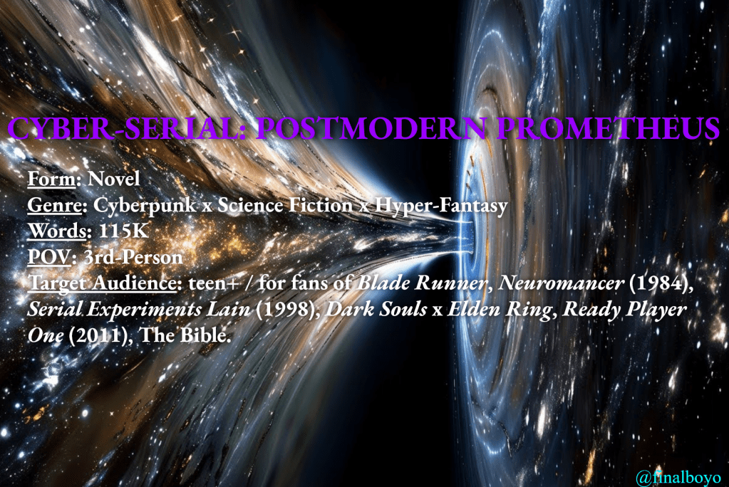 Howdy, friendly neighborhood writer Dylan here. Cyber-Serial: Postmodern Prometheus is a standalone cyberpunk x hyper-fantasy novel about a young hacker girl and the artificial being that she creates. The story is inspired primarily by Serial Experiments Lain, Blade Runner, and Cyberpunk ttrpg. Please read my advanced pitch below and I hope you consider buying my book.✌️