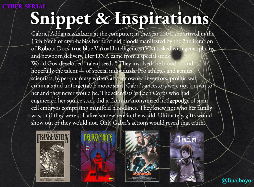 Gabriel Addams💽 is an ex-Jacker (revolutionary hacker) and current phantom (NEET). She has left behind a life as an online dissident and is trying to write a new story. In her self-styled fictional world, Gabri theorizes a serial killer AGI android targeting trillionaires, created by an e-girl with similar designs of her own…that decision, to write a novel, ends up changing the world.